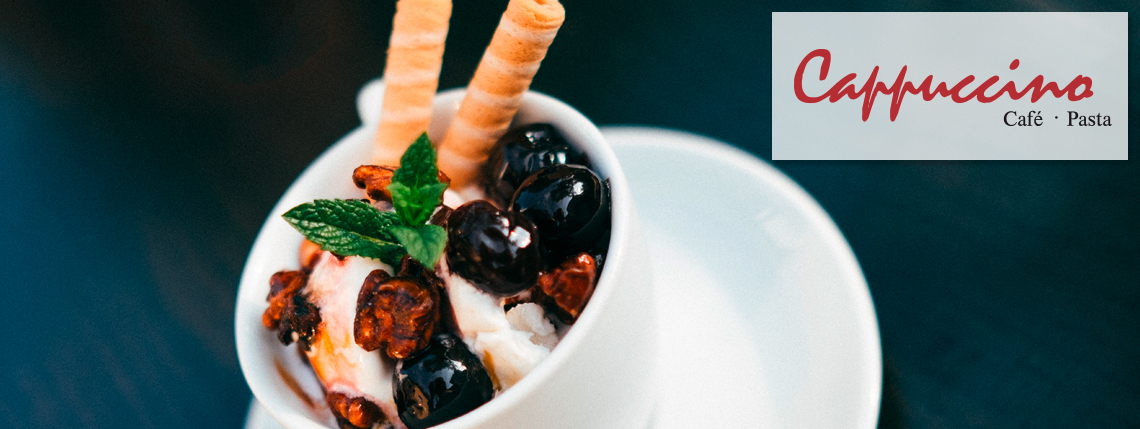 | Coppa Cappuccino Stracciatellaeis mit Eierlikör, Walnüsse und Amarenakirschen |